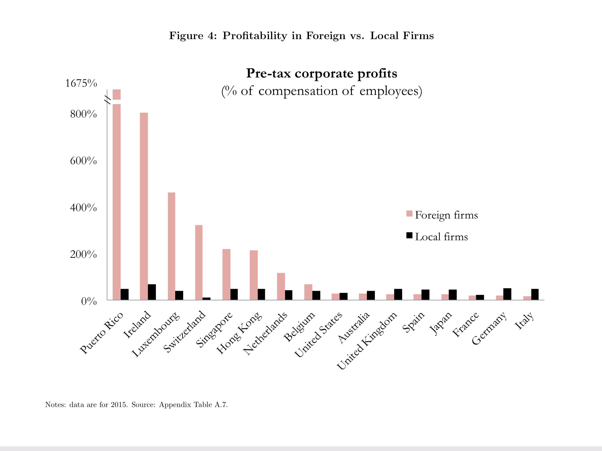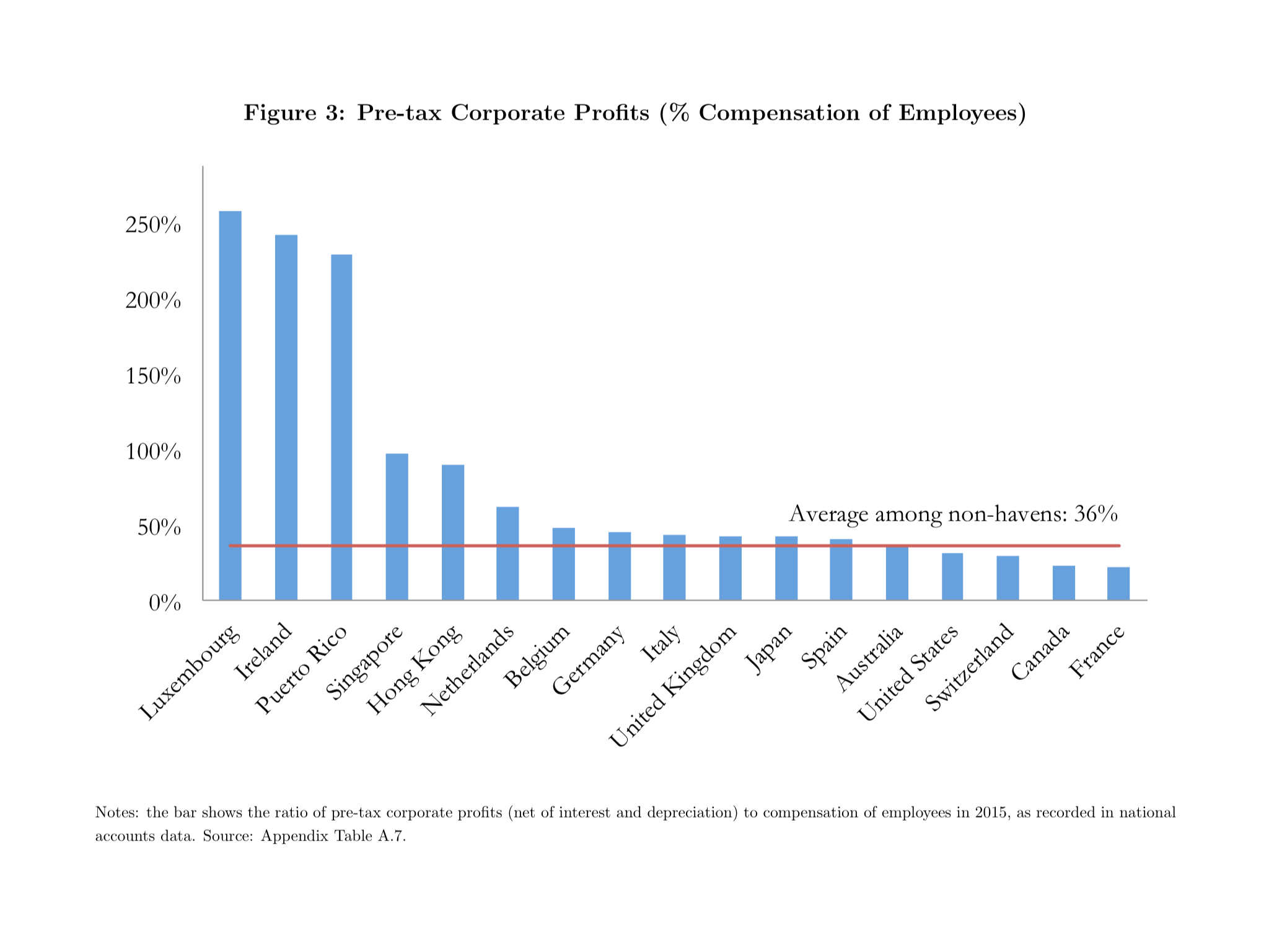 三位學者指出企業嘅「盈利對工資開支比率」(Profit to wage ratio)係好多個主要避稅港,都係較一般嘅成熟經濟體高好多。舉個例,係美國呢個比率係31%,係瑞典係39%,而係英國係42%。但一系列嘅「低稅率地區」例如新加坡同香港個比率係高過100%,而係較知名嘅避稅港例如愛爾蘭、波多黎各同盧森堡,個比率係高過200%。