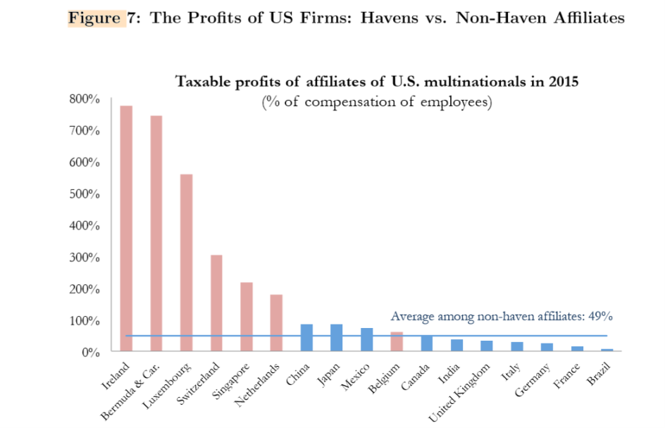 另一個驗證方法,就係比較美國企業係避稅港同係一般經濟體嘅子公司,兩者嘅盈利能力差距。一如預期,就算同為美國企業,係避稅港嘅子公司錄得嘅盈利對工資比率都係特別高,係愛爾蘭及百慕達仲高達近800%,遠遠高過非避稅地區錄得嘅49%。