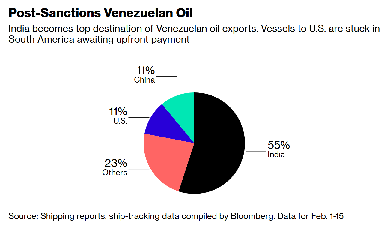 期內印度成為委內瑞拉石油出口最主要嘅目的地,Bloomberg報道指印度期內每日入口石油量上升66%,而印度佔委內瑞拉總石油出口亦佔55%。