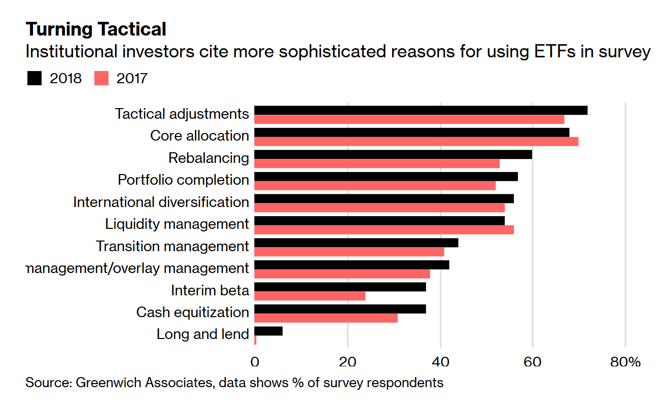 大型機構投資者平均投放25%資產落ETF(Exchange Traded Funds),呢個係由BlackRock贊助Greenwich Associates嘅研究結果。2017年機構投資者買ETF嘅比例係19%。