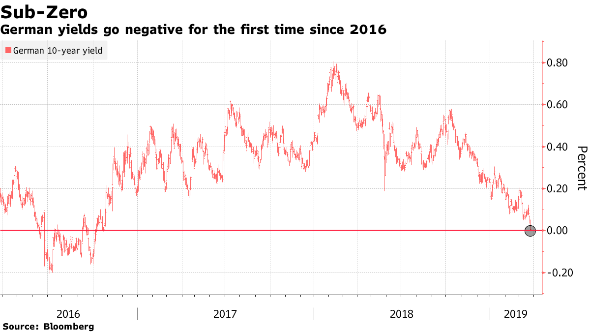 德國十年期國債孳息係今日隨價格上升而下跌,並終於跌至負數,為2016年以黎首次。