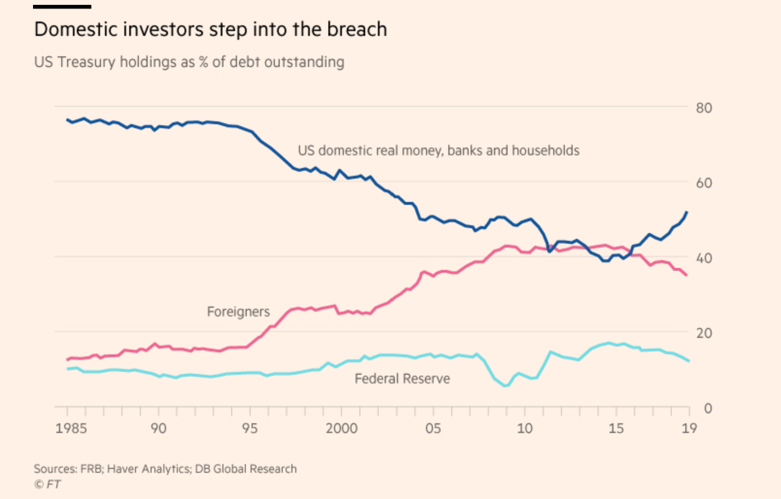 FT嘅記者Robin Wigglesworth喺文章《US investors step in as foreign funds tiptoe away from Treasuries》就從幾間投行嘅報告取來美國國債持有人佔比嘅歷史走勢,可以為上述嘅數字提供有用嘅背景詳情。