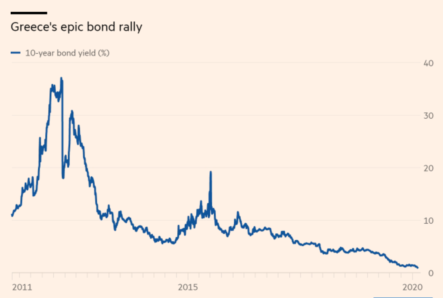 - 目前德國嘅十年期孳息率大約係-0.38厘,所以希臘係歐元區內唔算低息。