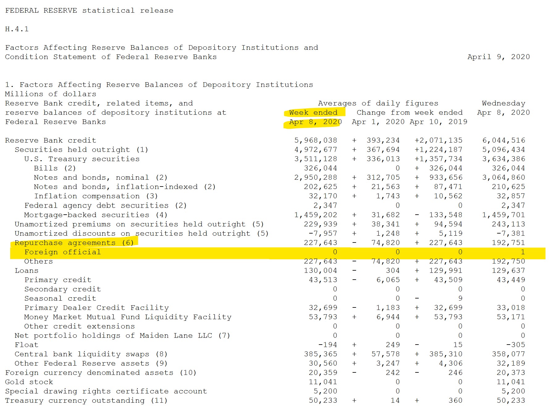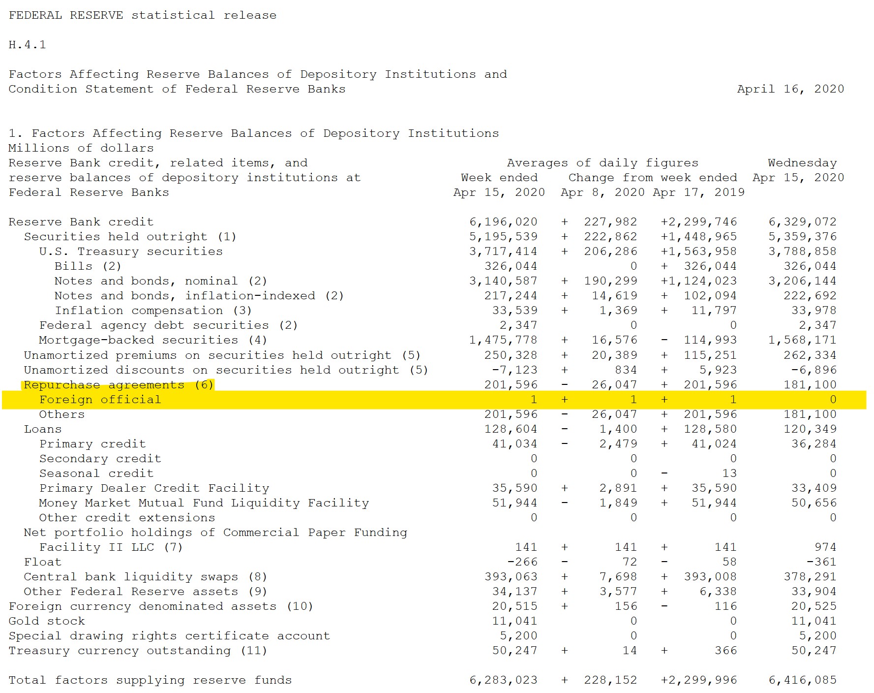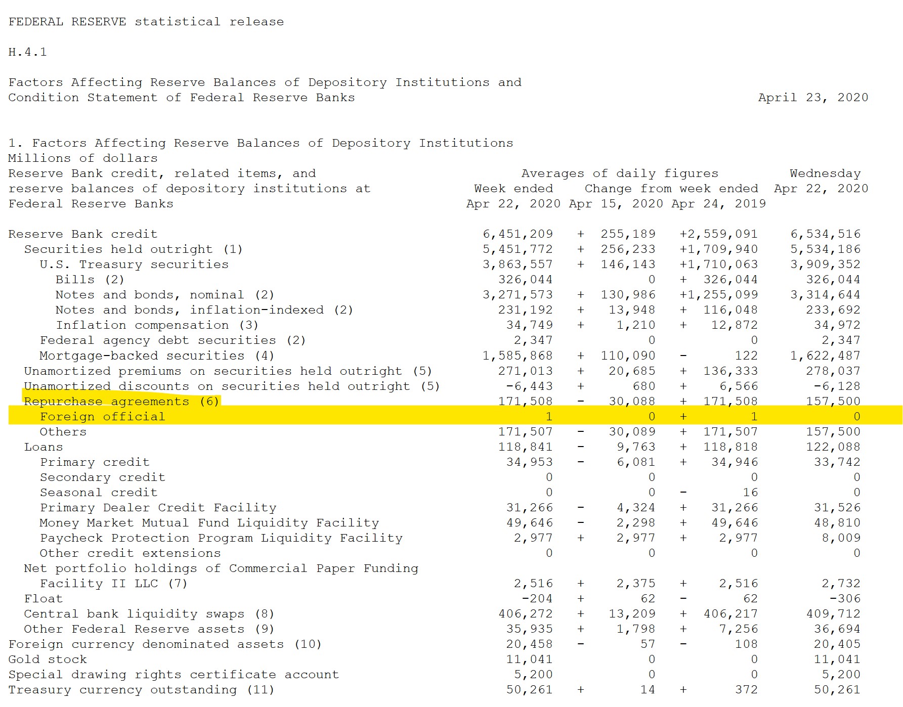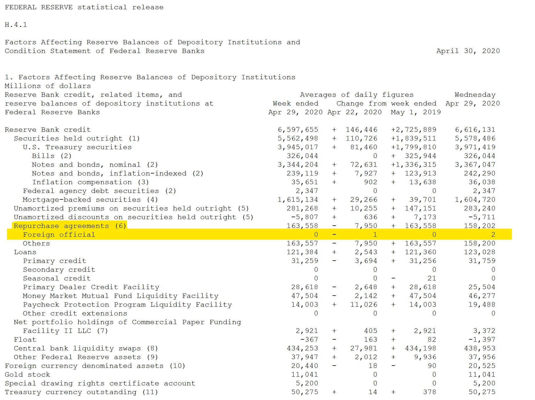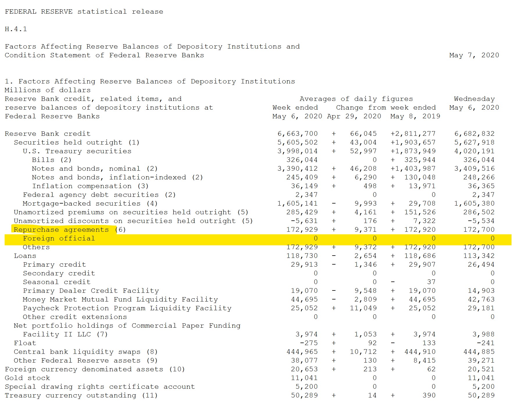 聯儲局自4月6日正式開啟FIMA Repo Facility 呢個工具以黎,其實近乎係無咩央行用過,只係4月8日至4月22日呢兩個星期錄得一百萬美元嘅借款,同係4月29日當日錄得二百萬嘅用量。相信大家都會同意,呢啲都係細得奇怪嘅用量。係截至5月6日嘅一周,聯儲局顯示FIMA Repo嘅用量係零。