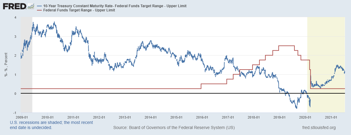 - 由另一個方向睇,由於聯儲局有保持通漲穩定(於平均2%)的職責,通漲大幅上升(至目前按年5.4%),理論上會令聯儲局收緊貨幣政策嘅速度更快更急。由於十年期國債孳息需要反映未來一連串聯儲局目標利率(Fed Fund Rate,FFR)嘅走向,若可見將來嘅FFR會急升,10年美國孳息都應該會現上升趨勢。