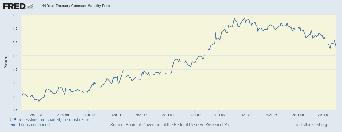 美國十年期國債孳息,喺通漲指標持續升溫嘅,反而由3月時嘅1.7%水平下跌至現時1.3%左右,情況有啲奇怪。