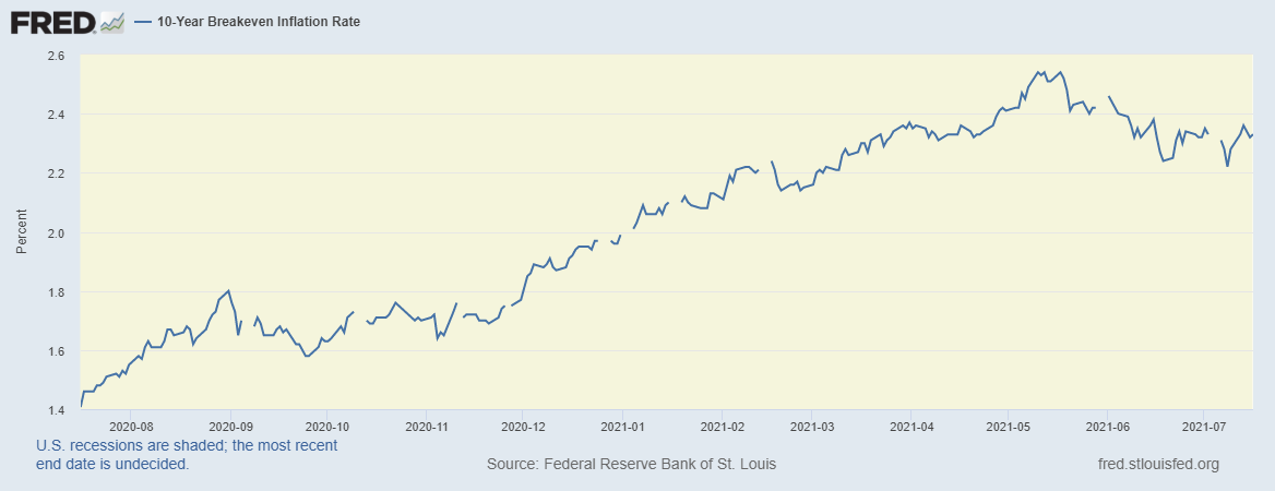 - 一個講法係市場對通漲嘅預期根本無上升。事實上,如果用十年期Breakeven通漲率(用十年期國債孳息減同年期嘅通漲保障國債)係5月中升穿2.5%後,已經回落至2.3%左右。