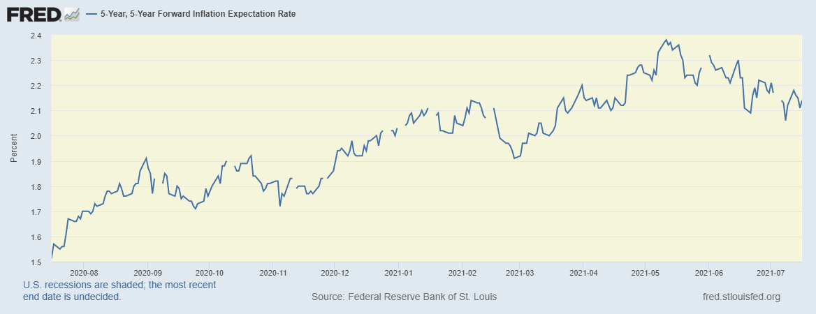 - 如果用5-Year, 5-Year Forward 預期通漲率亦都係相同嘅走勢,係5月中慢慢回落。