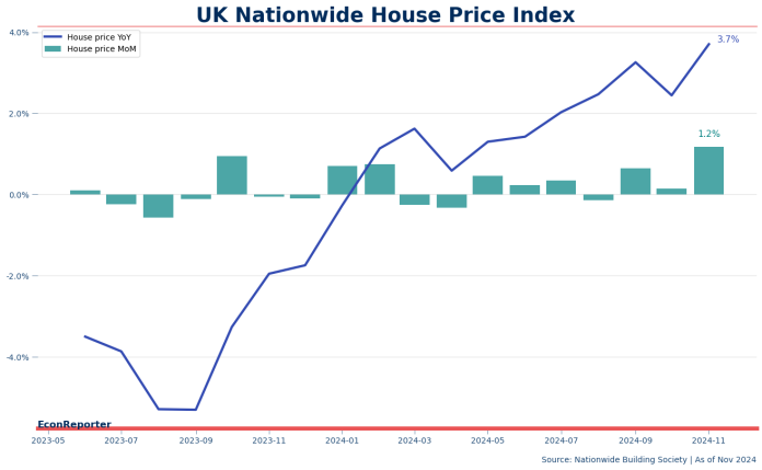 據英國Nationwide House Price數據,樓價喺11月錄得高達1.2%嘅按月升幅,為2022年3月以黎最大嘅單月升幅。按年嘅升幅亦增至3.7%,為兩年來最高。