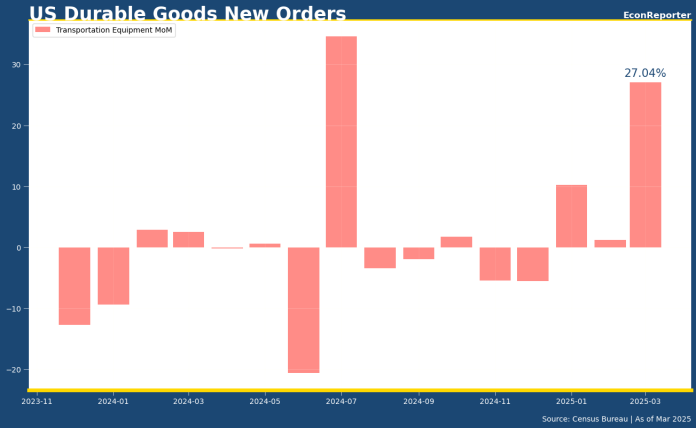 美國3月耐用品訂單按月升9.2%,大幅高過市場預期嘅2%,一個反射嘅估計就係啲人趕住想喺4月關稅之前落左order先。不過由於我地講緊嘅係新訂單數字(New Orders),而唔係銷售數字 (Shipments),前者通常係講唔會即時出貨嘅產品,所以同關稅預期嘅關係未必咁直綫。