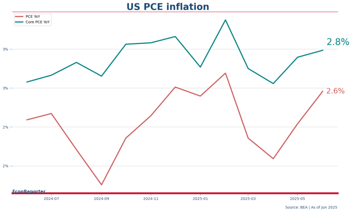 美國嘅PCE物價指數喺6月見到2.58%嘅按年增長,而核心(扣除能源及食品)通脹率則為2.79%,兩者都係高過市場預期。