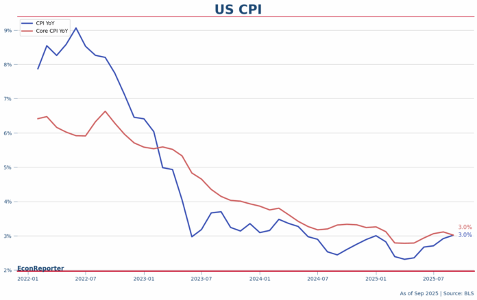 美國CPI通脹率喺9月由2.9%升到去3%,而扣除左能源同食品嘅核心通脹率則由3.1%跌返去3%。