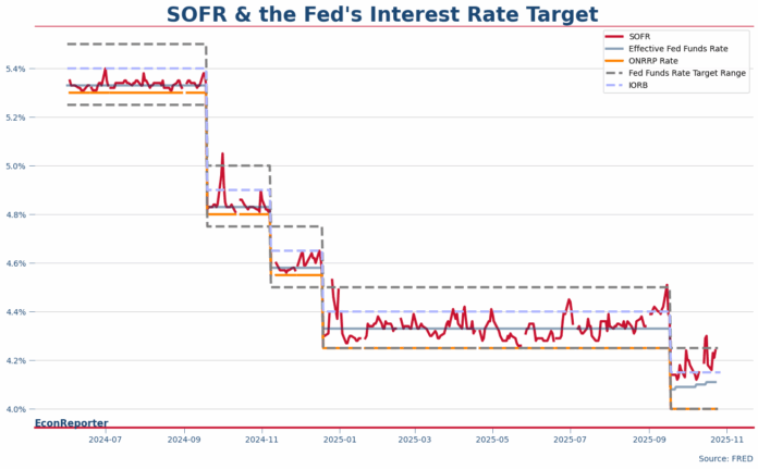 但大約9月開始,SOFR明顯長期高過IORB,去到聯儲局目標嘅上半部份。呢個情況,可以係反映到貨幣市場入面嘅流動性已經無咁「過盛」。而個問題就係聯儲局未必太介意貨幣市場利率係個別日子升穿佢嘅目標上限,但如果長時間有呢個情況就會變成「失去對利率嘅控制」。