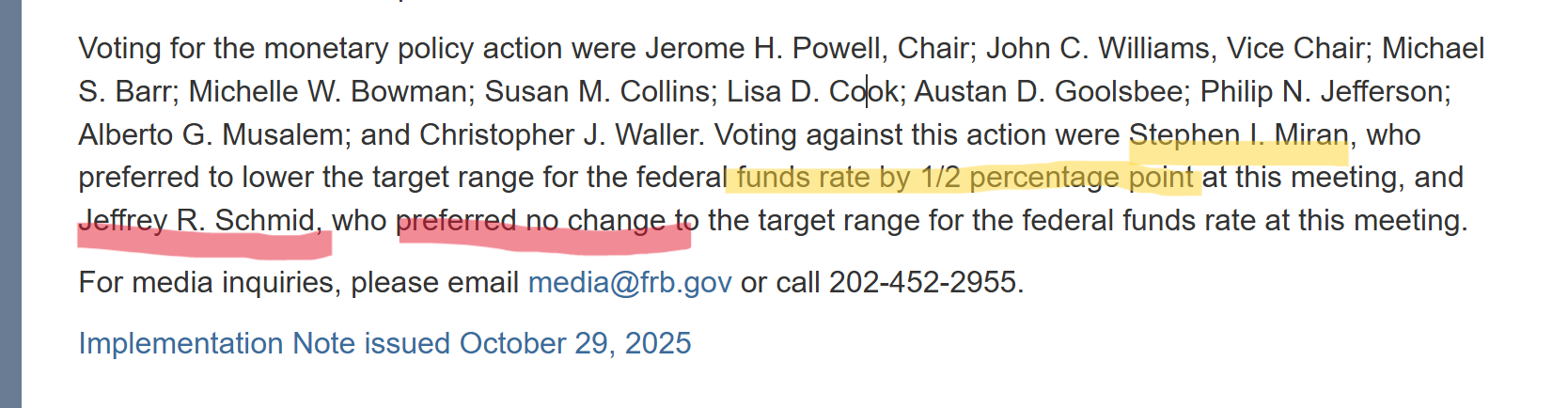 係記者會上聽到嘅係,因為利率已經降至3厘至4厘呢個部份委員覺得係自然利率所在嘅水平入面,所以呢部份嘅官員覺得需要「等一等」及「take a step back」,12月要睇下先決定減唔減息。咁反映FOMC入面放慢減息步伐嘅聲音都頗大,Powell需要喺記者會上刻意提及佢地嘅諗法。