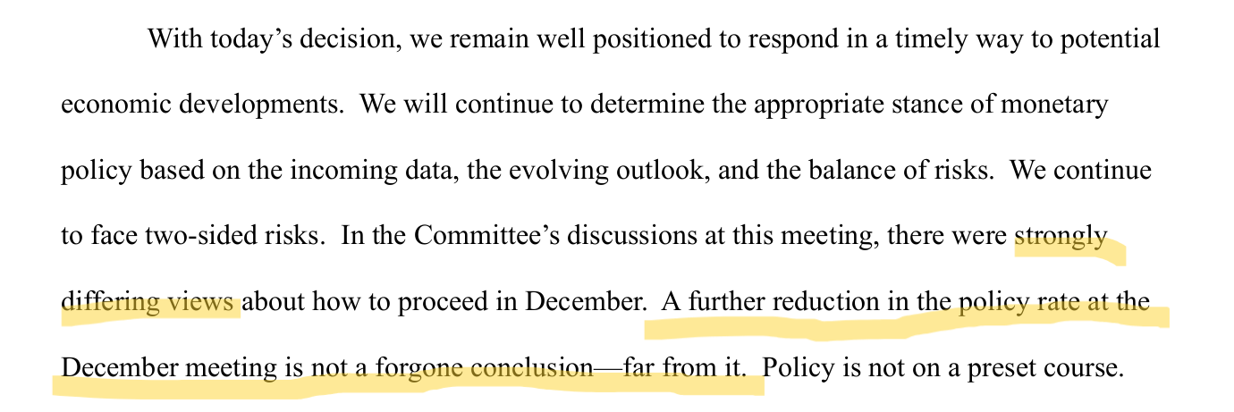值得留意係,喺記者會嘅開場白,主席Powell講明FOMC內部對12月減息與否,有「Strong differing views」(不同強烈嘅意見),減息並唔係一個預定嘅決定(A further reduction in the policy rate at the December meeting is not a forgone conclusion),仲要加一句「far from it」。