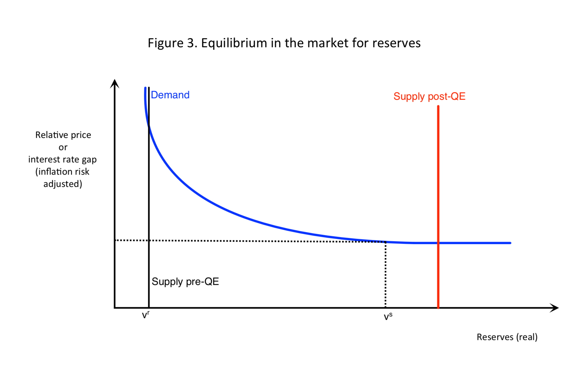 理論上,銀行體系嘅儲備需求曲綫係右向下斜,即係當持有儲備嘅成本下降,對儲備嘅需求量就會增加。直至某一點,銀行體系認為儲備量充足有餘, 多一啲少一啲都無分別, 咁儲備需求曲綫就會變成橫綫, 供應改變唔會可以改變利率既均衡水平。