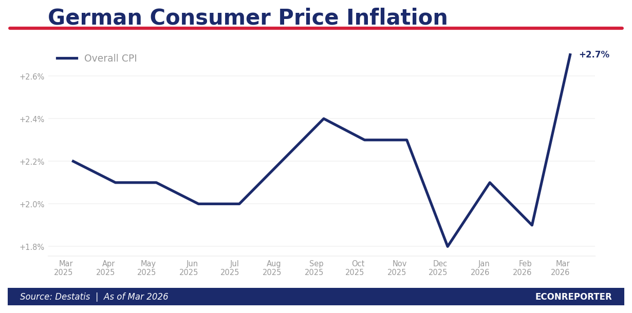 - 德國統計局周一出左3月CPI通脹率嘅初值,按年升幅由2月嘅1.9%急升至2.7%。