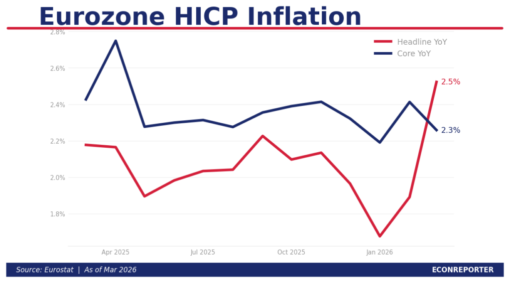 - 歐元區整體通脹3月初值升至2.5%,比2月嘅1.9%按升升幅高6個百分點。